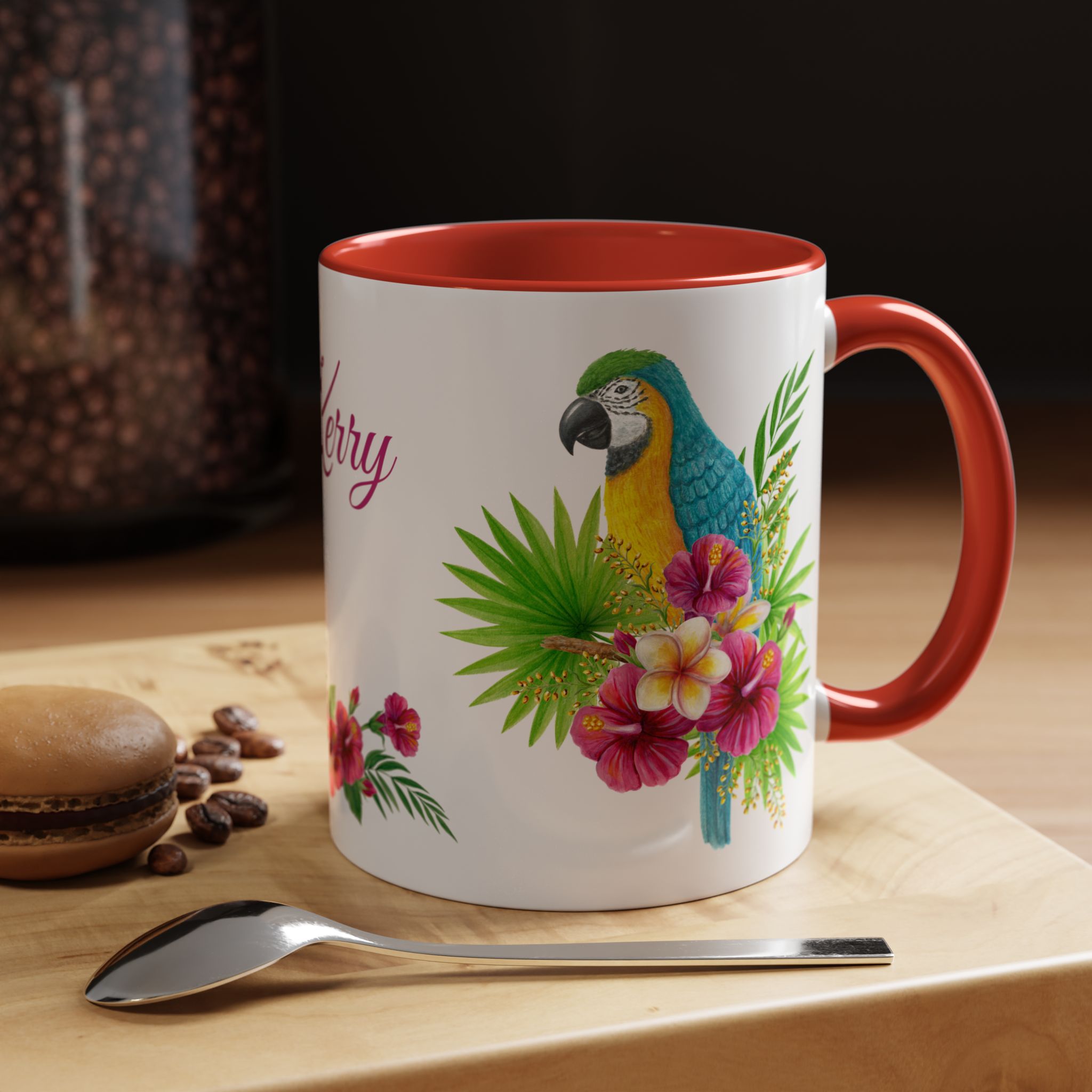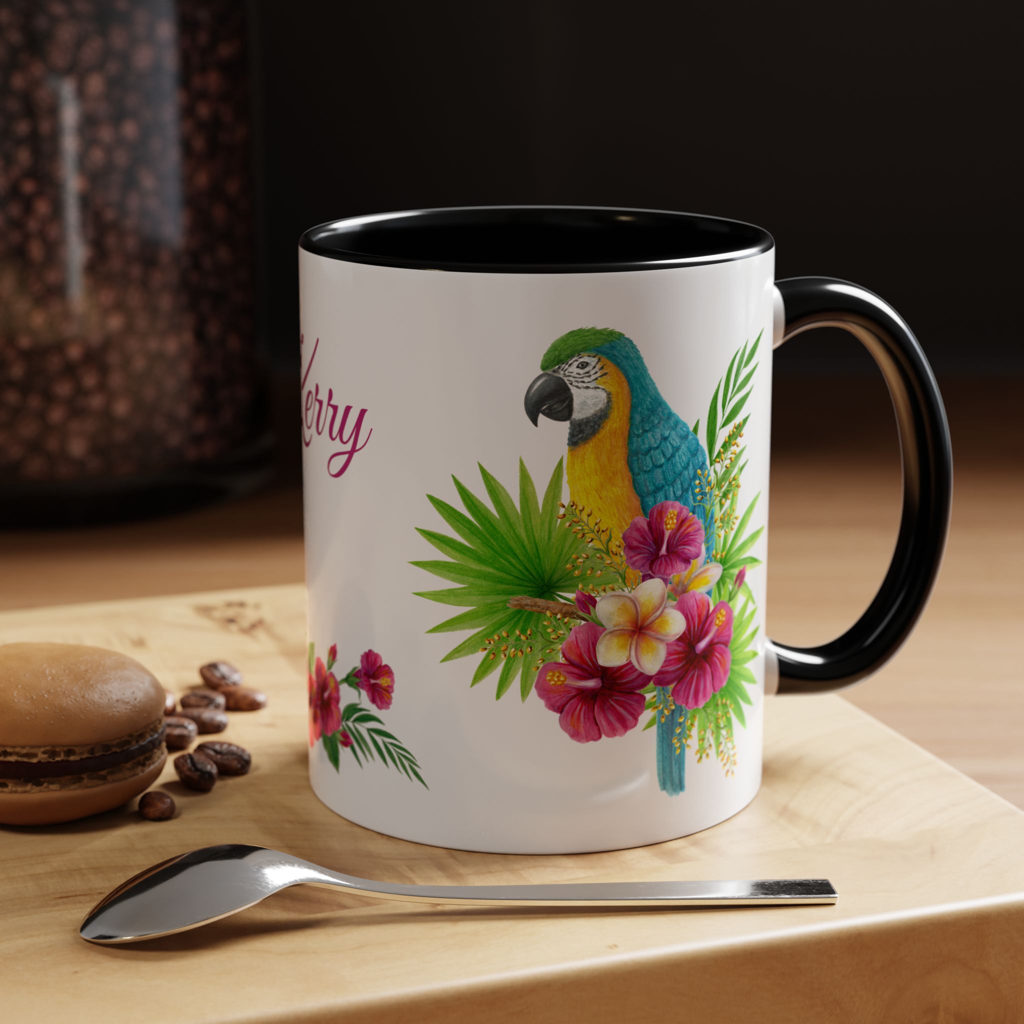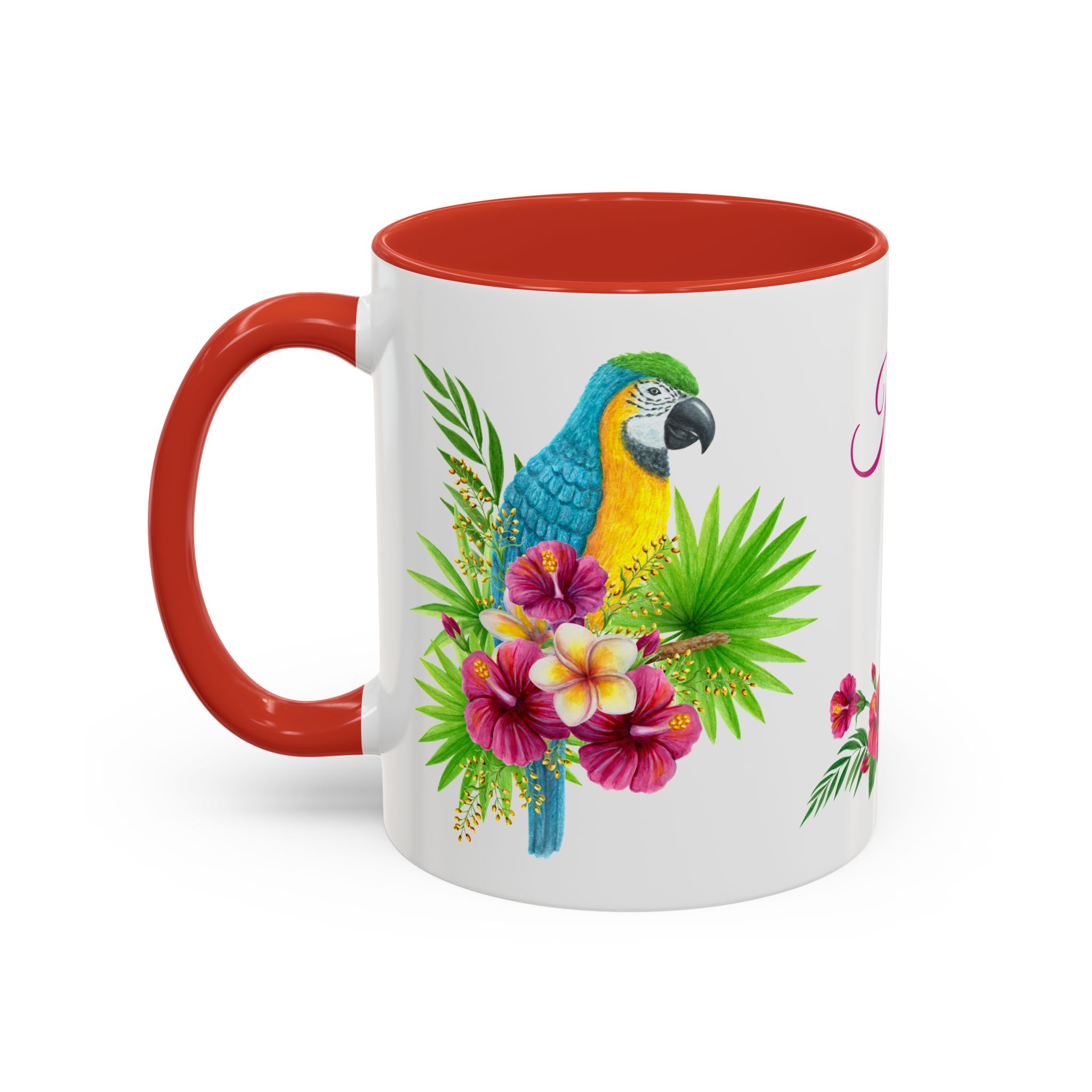 This is a pretty macaw with flowers and custom name sublimation art design on a quality ceramic coffee mug. Comes in both 11 oz and 15 oz sizes plus 7 different colors! Each color is on the inside of the mug and the handle for a sharp contrast.