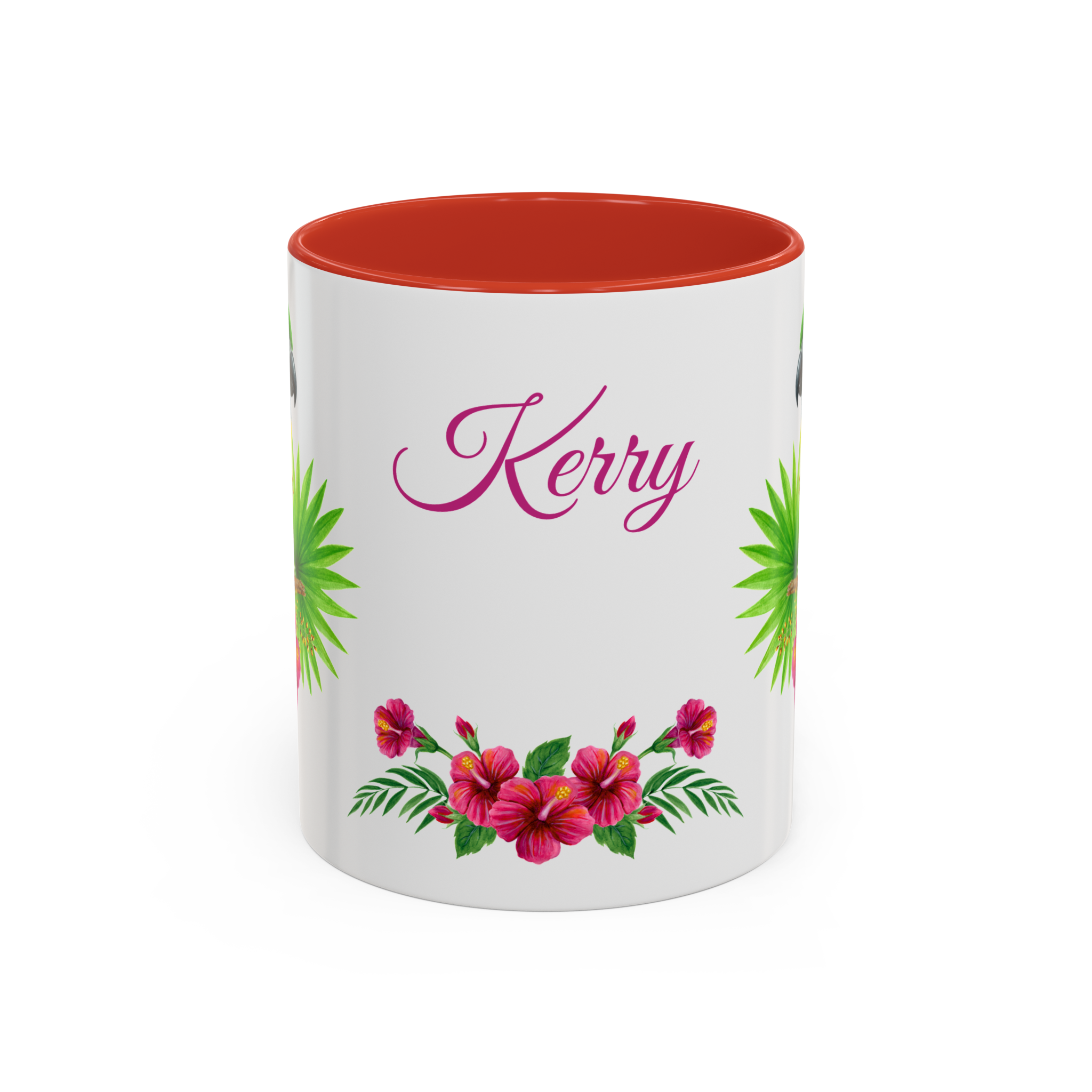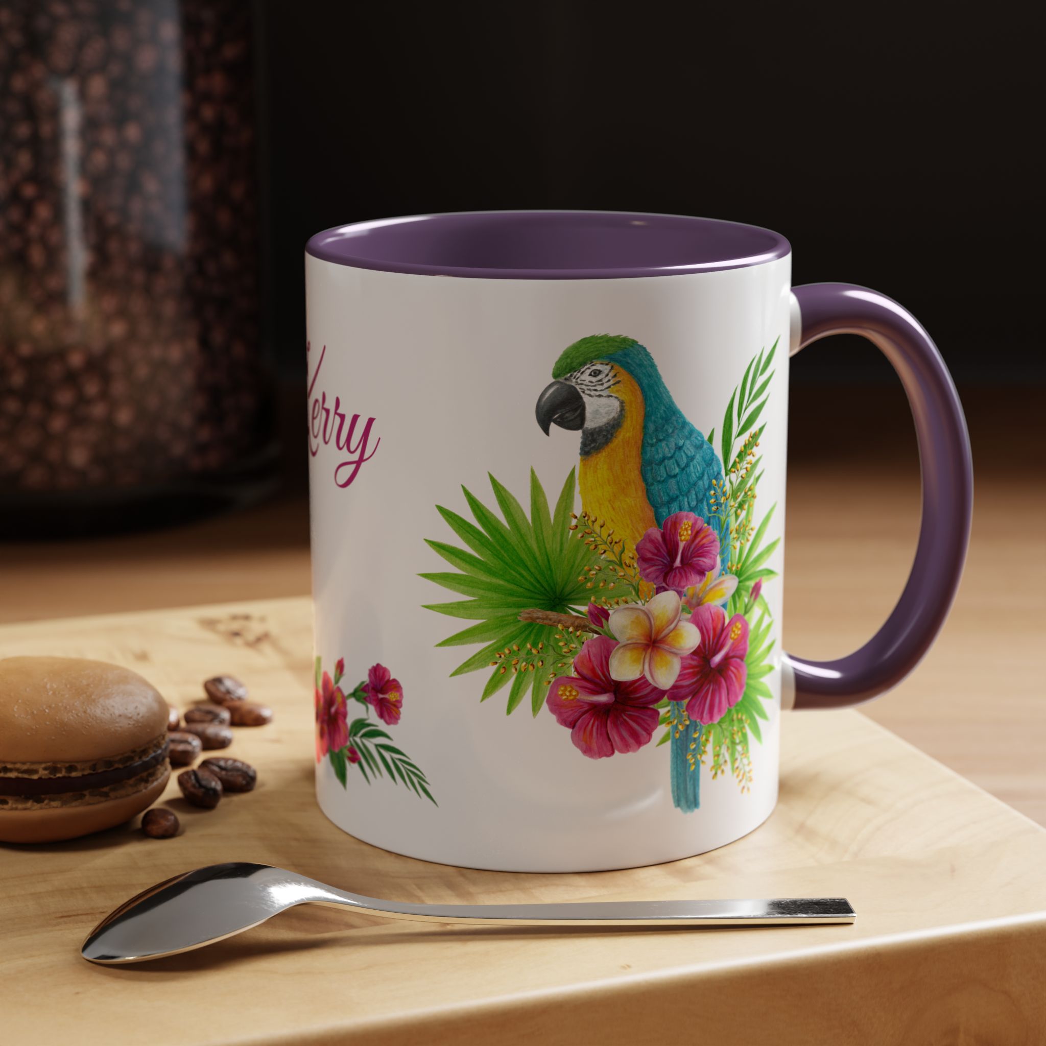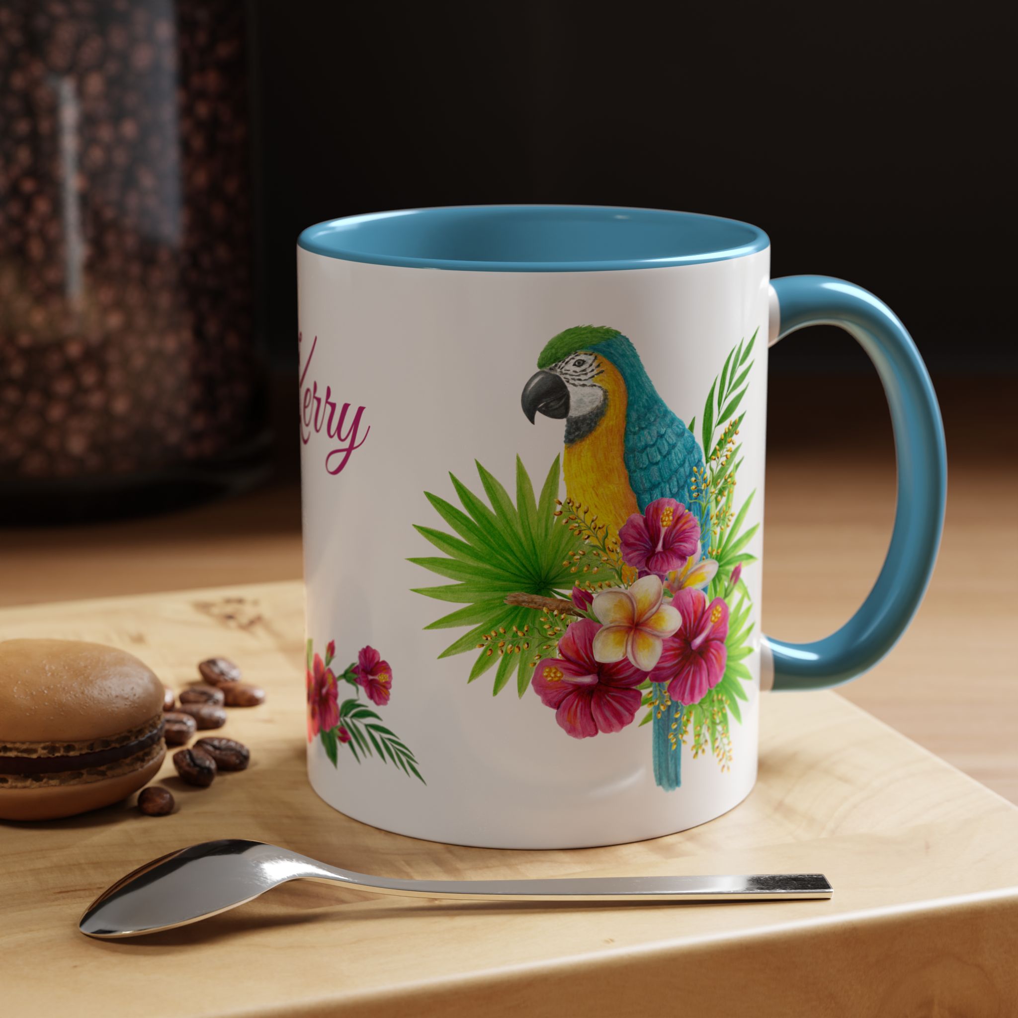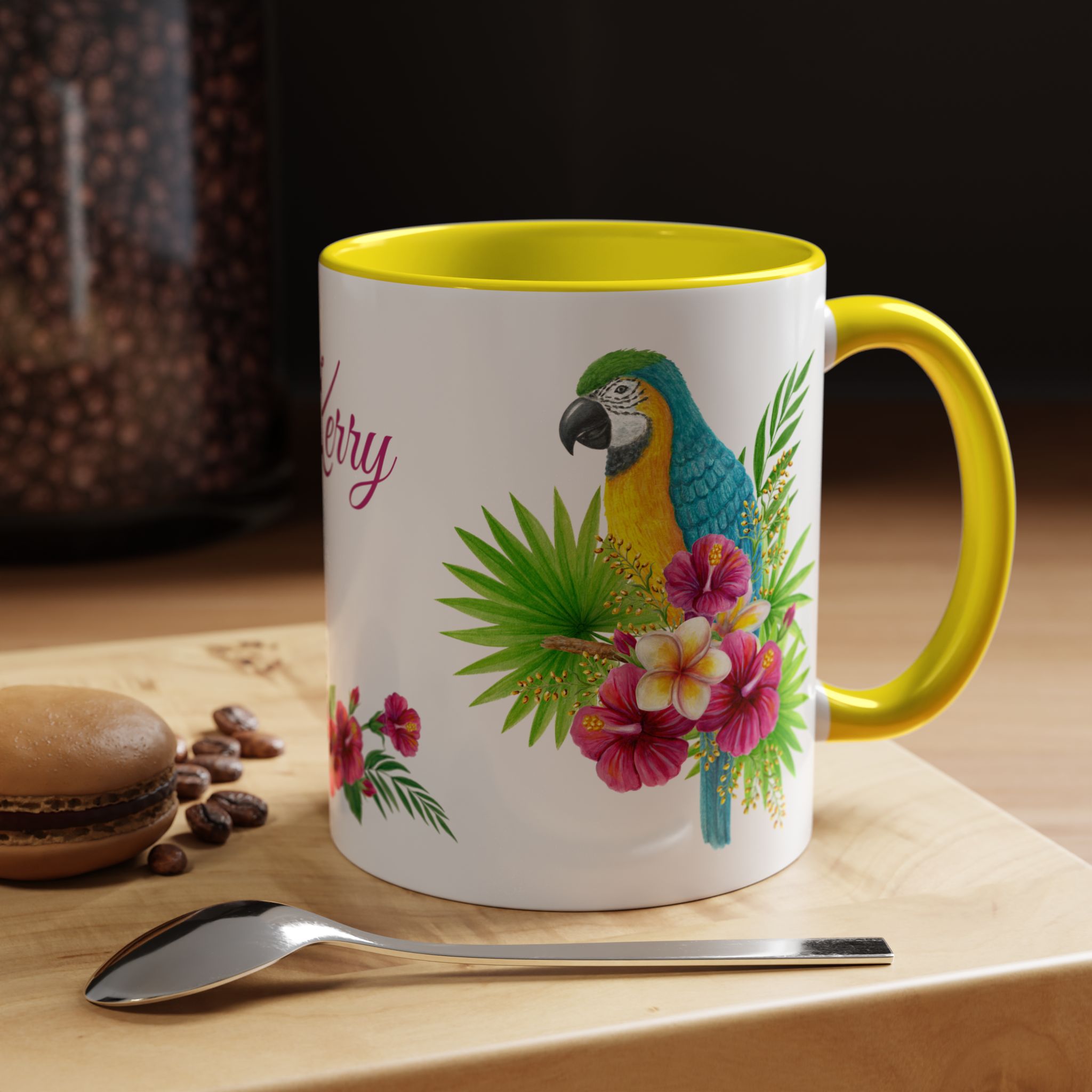 This is a pretty macaw with flowers and custom name sublimation art design on a quality ceramic coffee mug. Comes in both 11 oz and 15 oz sizes plus 7 different colors! Each color is on the inside of the mug and the handle for a sharp contrast.